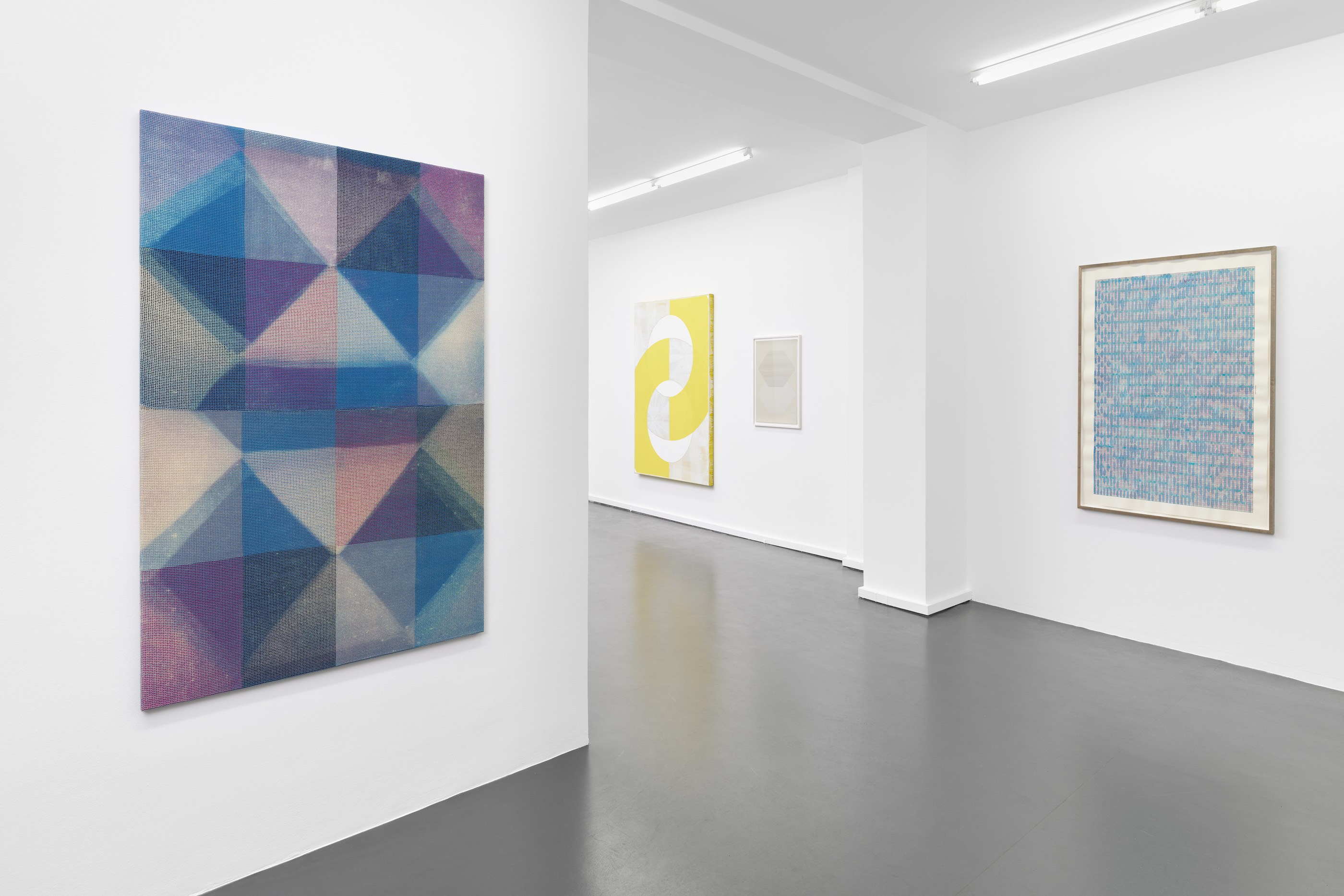 Symmetrical geometries in saturated purples, reds, magentas, and blues contrast with washed-out pastels – negative spaces of sorts. The imperfect edges of the triangles, trapezoids, diamonds, and parallelograms; the diagonal, vertical, and horizontal axes, blur – but never entirely – into, onto, and over each other in a soft play of gradations and shadows. Viewed from just a short distance, the shapes shimmer, flicker. Berlin-based artist Anja Schwörer’s textile works are multidimensional, but also somehow transcendental, studies in shape, color, and materiality.